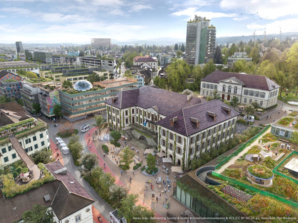 Im Aargau wird nachhaltige Stadtgestaltung großgeschrieben: Auf den Dächern von Regierungsgebäuden und Kunsthäusern sorgen Solaranlagen für sauberen Strom, während Begrünung das Stadtklima positiv beeinflusst. Anstatt motorisiertem Individualverkehr dominieren Fuß- und Veloverkehr die Straßen, die in lebendige Begegnungszonen verwandelt wurden. Die Stadt setzt auf eine produktive Nutzung von Gebäudeflächen, wie Solarpanels und Algenfarmen, die zur Kreislaufwirtschaft und Energieproduktion beitragen.