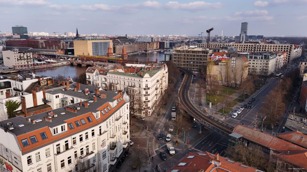 Berlin war nie eine Stadt, die sich mit halben Lösungen zufriedengibt – das zeigt sich auch am Schlesischen Tor 2045! Der einstige Lärm-Hotspot ist in unserer neusten Zukunftsgrafik eine realutopische Begegnungszone geworden. Es gibt Musikbühnen, offene Werkstätten und Bücherregale, Spielplätze und Kletterwände, moderne schnelle E-Shuttles und gute Fußwege. Bei den alten Fabrikhallen am Wasser summen Bienen zwischen vertikalen Gärten, während Start-ups und regenerative Kooperativen hier an den neuesten Kreislauf-Projekten arbeiten. Auch die berühmte Clubszene hat sich gewandelt: Die Energie für die Tanzflächen stammt aus Fußboden-Generatoren, die von den Feiernden selbst betrieben werden. Das ist Berlin: kreativ, widerständig, ein bisschen improvisiert – und dabei 100 % nachhaltig. Die Grafik haben wir erstellt im Auftrag vom Bezirksamt Friedrichshain-Kreuzberg mit unseren Grafik-Partnern von loomn.