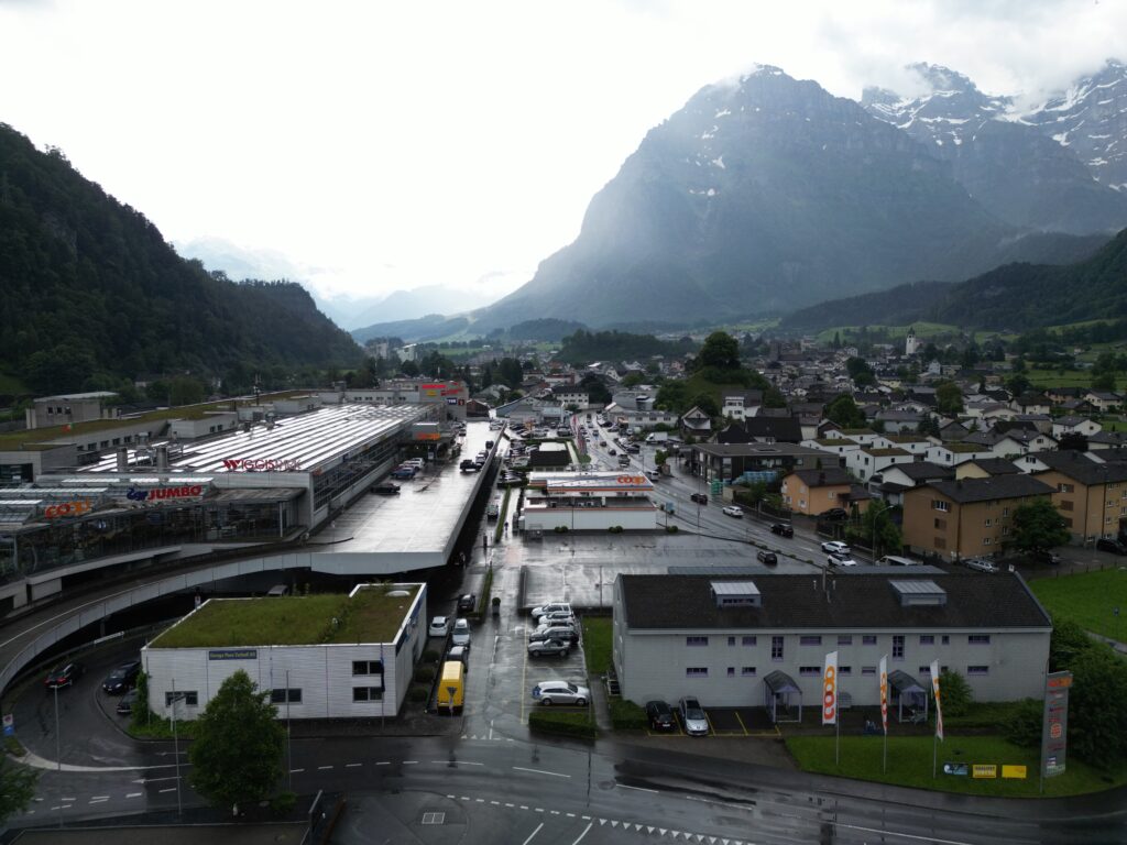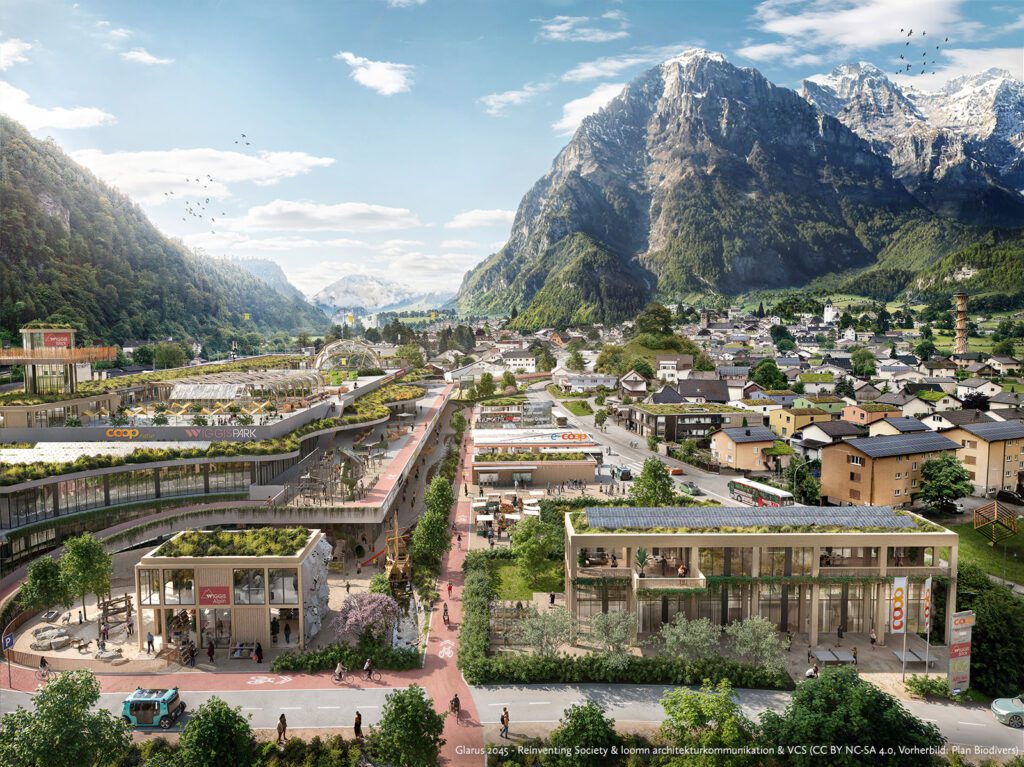 Im Jahr 2045 wird der Wiggispark in Glarus zu einer grünen Oase, die eine nachhaltige Zukunft verkörpert. Der Park, der früher von Asphalt dominiert wurde, wird nun zu einem lebendigen Begegnungsraum, in dem grüne Flächen, durchgehende Velowege und umweltfreundliche Mobilität im Einklang stehen. E-Cargo-Bikes und elektrische Liefershuttles transportieren Waren nachhaltig, während Recyclingmaterialien für die Gestaltung der Umgebung genutzt werden. Ein freigelegter Bach trägt zur Reduzierung der sommerlichen Hitze bei und schafft ein angenehmes Mikroklima, das den Park zu einem erfrischenden Rückzugsort macht.