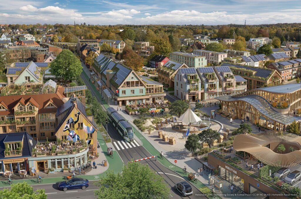 Die Grafik zeigt die Hauptstraße in Heikendorf, wie sie auch sein könnte: autofrei, lebendig und nah am Wasser. Wo früher Tempo 50 galt, fahren heute Straßenbahn und Fahrräder – der Autoverkehr wurde aus dem Ortskern verlagert.
