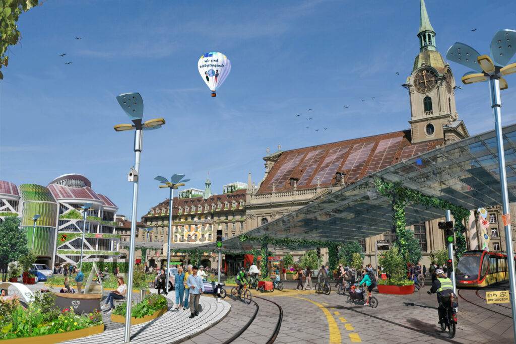 - Das starr wirkende und ökologisch nachteilige Bahnhofsgebäude erfährt einen Komplettumbau. Dachsolar und eine Fassade mit Einsatz von nachhaltigen Baustoffen und sogar Algen zur Erzeugung von Energie machen das Gebäude klimaneutral und im besten Fall klimapositiv.