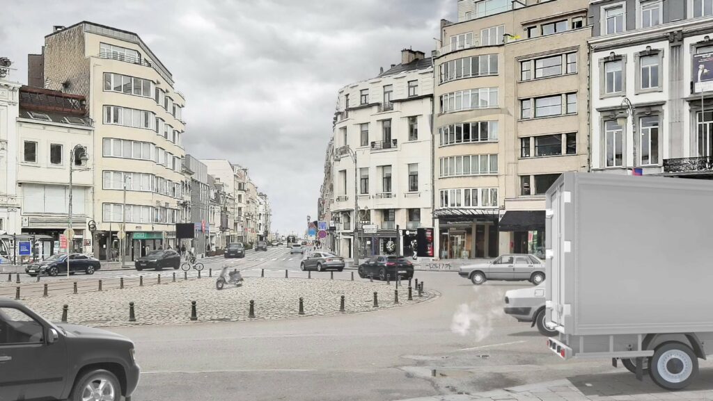 Entstanden innerhalb des Projekts „Visual Utopias“, in dem Jan Kamensky eine spielerischen Transformation von autodominierten Straßen zu menschenfreundlichen Orten vornimmt. Besonders bei dieser Animation sind die drei Zeitebenen: Vergangenheit, Gegenwart und Zukunft. Eine historische Postkarte aus dem Archiv der königlichen Bibliothek Belgiens dient als Ausgangsmotiv und wird zum Leben gebracht.