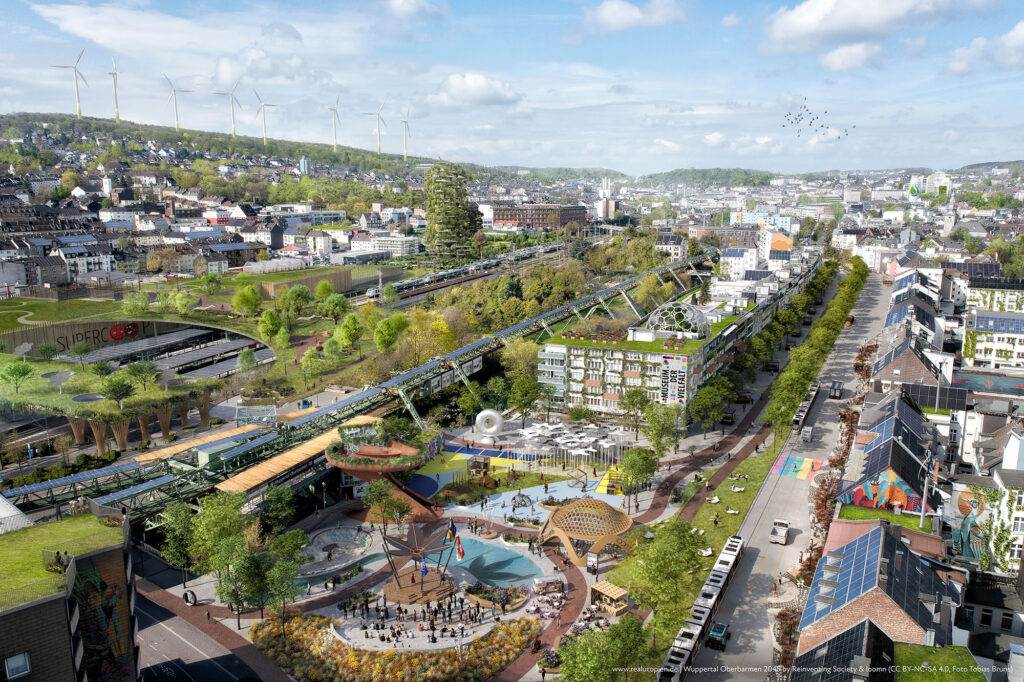 So wie auf diesem Bild, könnte Wuppertal-Oberbarmen im Jahr 2045 aussehen. Mit der Organisation »Reinventing Society« aus Berlin haben wir geträumt, geplant, geforscht um diese Zukunftsvision entwerfen zu lassen.